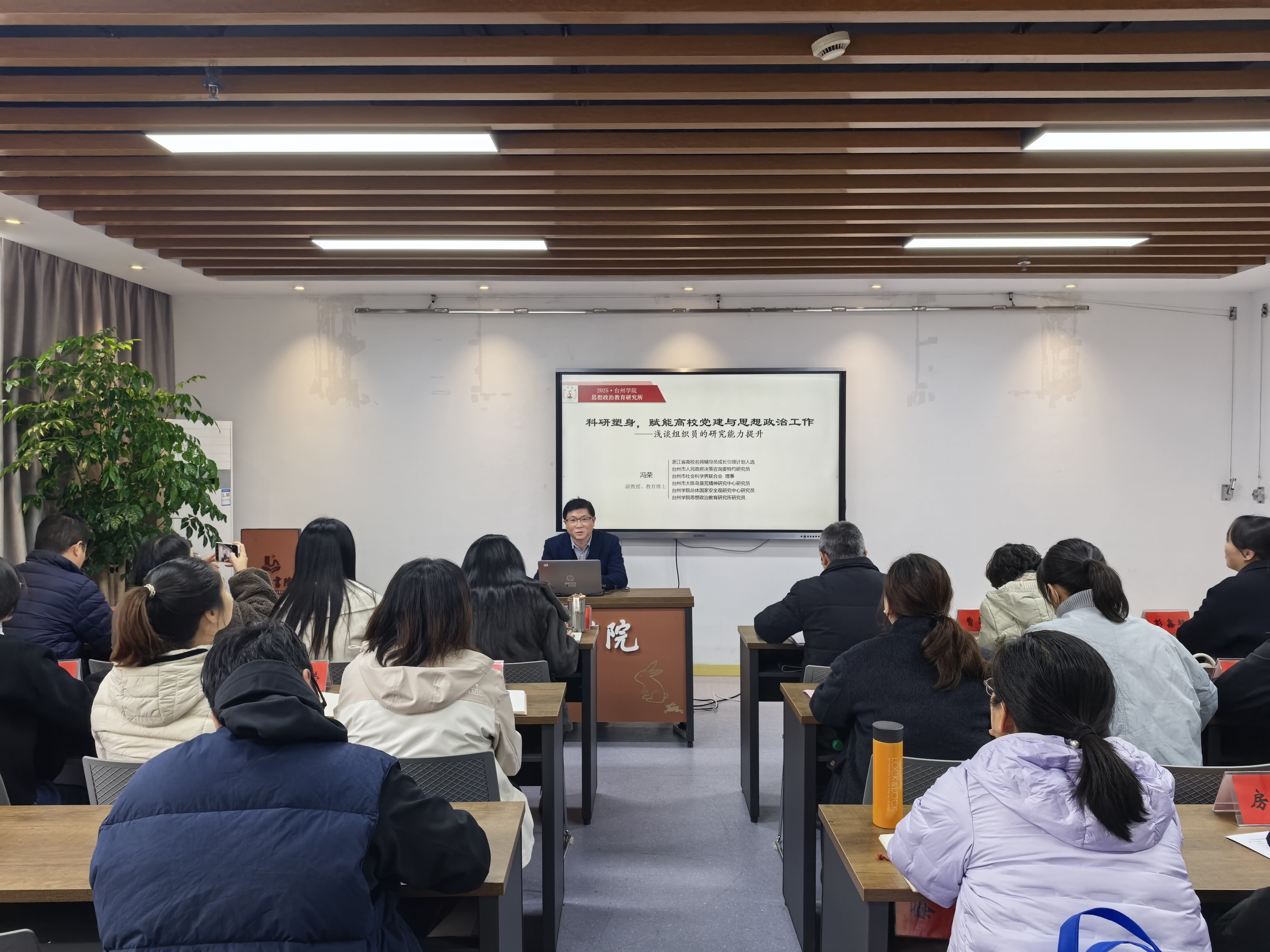 台州学院宣传部(教师工作部)副部长冯荣作《以科研塑身,赋能高校党建与思想政治工作》专题辅导。他围绕组织员科研能力建设,从找准自身定位、明确岗位职责、坚定科研成长信念、把握科研方法路径、个人心得体会等五个方面,全面系统讲授了如何开展科研工作。同时,结合自身科研实践,深入讲解科研选题、申报立项、论文撰写等方法技巧,有针对性地指导组织员科研实操。